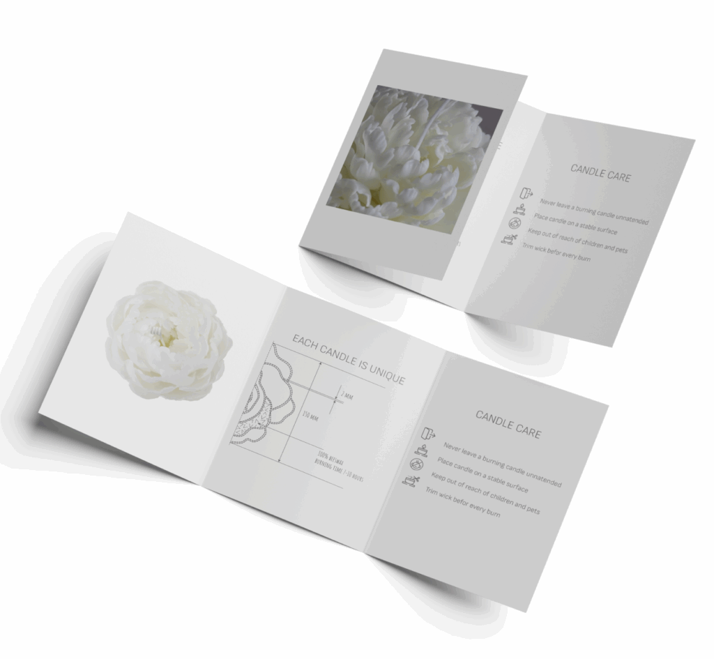 The flyer presents the product clearly and elegantly, highlighting candle care and uniqueness. It’s more than an informational handout — it can be placed in salons, boutiques, and spas, where it shares the brand’s message and adds a touch of refinement.
